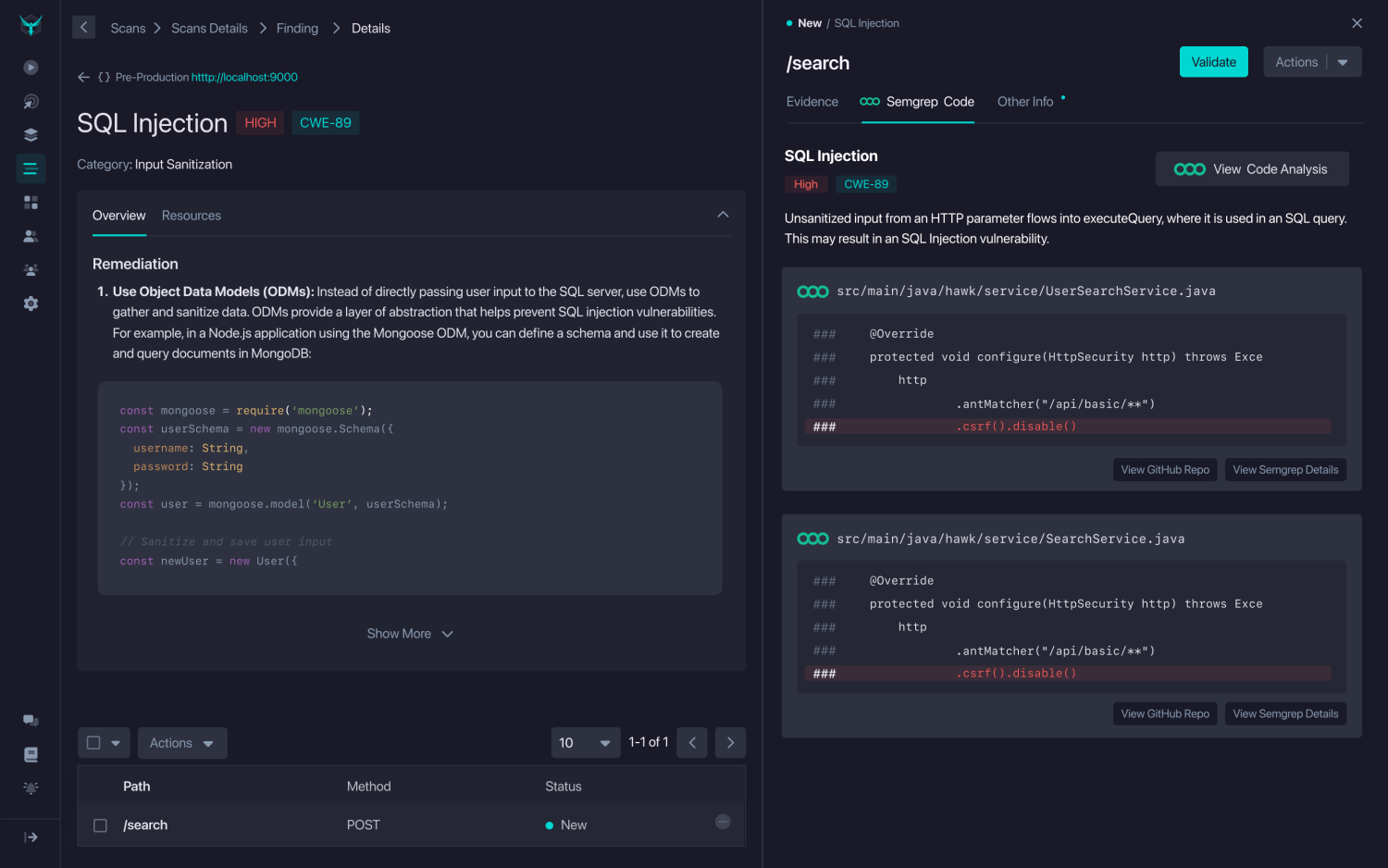 Figure 2: Connecting the Dots; correlated Semgrep findings linked with StackHawk runtime validation provide traceability from code to execution.