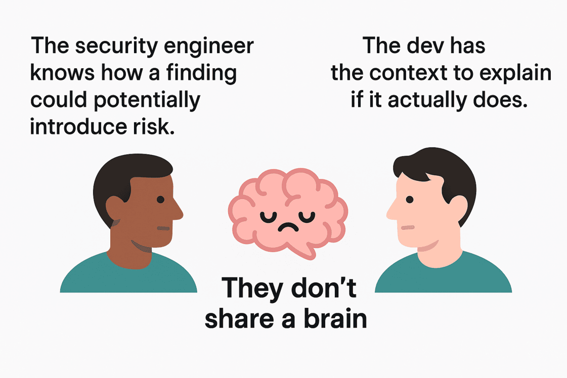 This context/knowledge gap is why developer <-> security workflows are often frustrating.