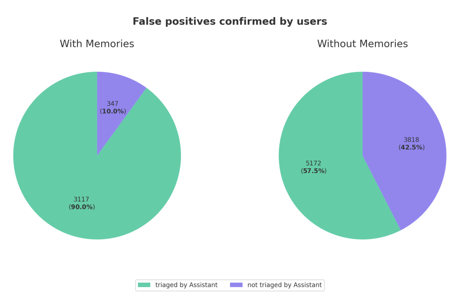 Looking at a dataset of total false positives (confirmed by users), we can see that memories give Assistant the context needed to take action on far more findings.