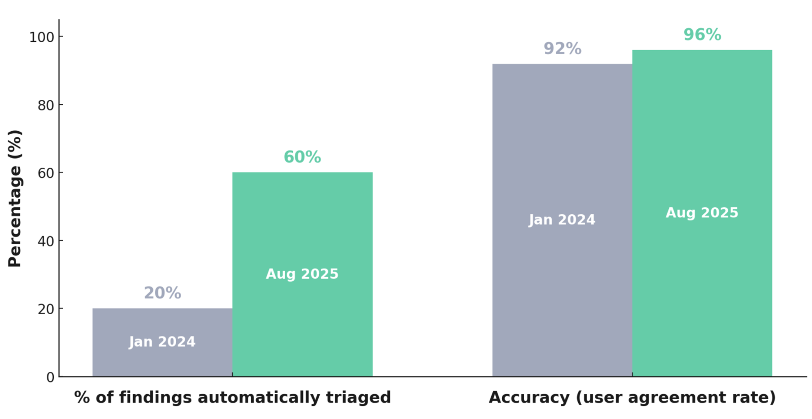 The 96% figure isn’t derived from an internal benchmark or methodology — it’s the real-world agreement rate. In other words, it’s the percentage of Assistant triage decisions that actual customers, reviewing real findings in their code, confirm as correct.